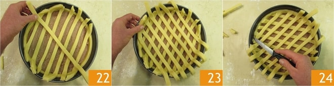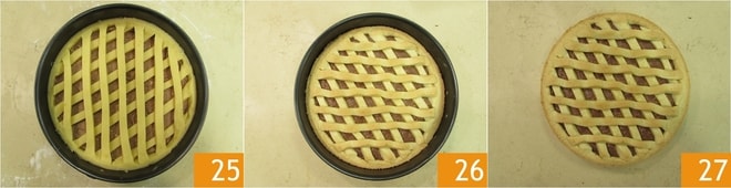 Une fois la grille avec les losanges réalisée 23, vous pouvez cuire la tarte dans un four statique préchauffé à 180° pendant 40 minutes. Une fois ce temps écoulé, sortez-la du four 26 et laissez-la refroidir avant de la démouler et de la servir 27.
