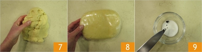 Transférez la pâte sablée sur le plan de travail 7 et formez une boule. Enveloppez-la avec un film plastique 8 et laissez reposer au réfrigérateur pendant au moins 1 heure. Pendant ce temps, préparez la crème de ricotta et Nutella. Versez le sucre dans un petit bol 9 et ajoutez les graines de la gousse de vanille 9.