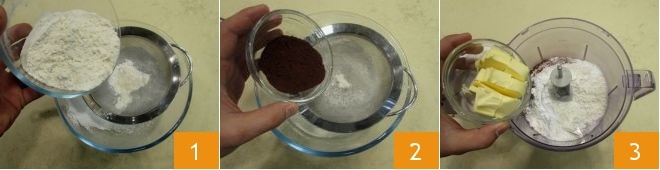 Pour préparer la tarte au cacao avec crème à la ricotta et chocolat, commencez par la pâte sablée au cacao; tamisez la farine 1, le cacao en poudre 2 et le sucre glace, puis versez les poudres dans un mixeur avec le beurre froid coupé en morceaux 3. Mixez le tout jusqu'à obtenir une texture sableuse et farineuse,