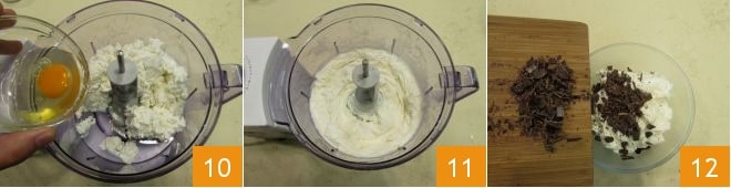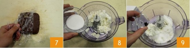 Formez une boule, enveloppez-la dans un film plastique 7, puis laissez-la reposer au réfrigérateur pendant 30 minutes. Pendant ce temps, préparez la crème à la ricotta et chocolat : mettez dans un mixeur équipé de lames la ricotta, le sucre en poudre 8 et les graines d'une gousse de vanille 9.