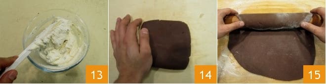 mélangez avec une spatule 13, couvrez de film plastique et mettez au réfrigérateur. Après le temps de repos 14, étalez la pâte au cacao avec un rouleau à pâtisserie, en utilisant le moins de farine possible, en formant un cercle de 6-7 mm d'épaisseur 15.