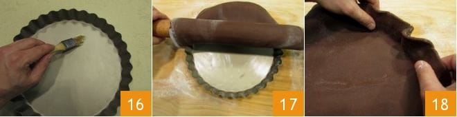 Avec un pinceau, beurrez légèrement un moule à tarte de 24-25 cm (vous pouvez également utiliser un moule à tarte) 16. Avec l'aide du rouleau à pâtisserie, tapissez le moule avec la pâte sablée 17, en veillant à bien faire adhérer les bords 18.