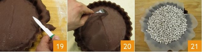 Coupez les excès de pâte en gardant un bord d'au moins 2 cm de hauteur : mettez de côté et recombinez les chutes, elles serviront pour la décoration finale 19. Piquez le fond avec les dents d'une fourchette 20, et couvrez avec une feuille de papier sulfurisé que vous remplirez de légumineuses sèches ou de billes en porcelaine pour la cuisson à blanc 21. Enfournez dans un four statique préchauffé à 175°C pendant 20 minutes (ou à 155°C pendant 12 minutes si dans un four à chaleur tournante). Après ce temps, retirez les billes de céramique (ou les légumineuses) et le papier sulfurisé et laissez cuire encore 5 minutes à la même température. Une fois prêt, sortez du four et laissez refroidir.