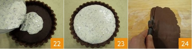 Versez la crème de ricotta à l'intérieur de la pâte désormais froide 22 (vous pouvez également mettre la garniture dans une poche à douille sans douille avec un trou) et égalisez la garniture avec une cuillère 23. Étalez la pâte sablée restante sur le plan de travail légèrement fariné et découpez des bandes de 6 mm de large et de 2-3 mm d'épaisseur avec une roulette dentelée 24.