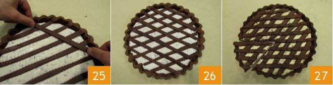 Disposez les bandes de pâte sablée sur la crème à la ricotta en diagonale 25 de manière à former des losanges 26. Faites cuire à nouveau dans un four statique préchauffé à 175°C pendant 10-15 minutes (ou à 155°C pendant 8-10 minutes si dans un four à chaleur tournante). Une fois prête, laissez-la complètement refroidir ; enfin, vous pourrez servir votre tarte au cacao avec crème à la ricotta et chocolat 27.
