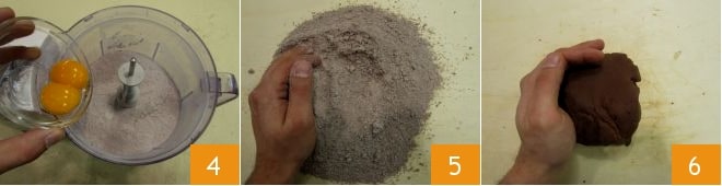 puis ajoutez les jaunes d'œufs 4 et continuez à mixer. Transférez la pâte (qui sera encore farineuse et non homogène) sur un plan de travail 5 et pétrissez vigoureusement avec les mains jusqu'à obtenir une pâte assez compacte et lisse 6.