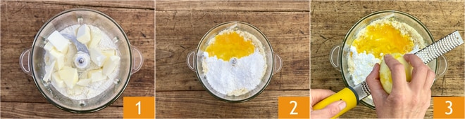 Pour préparer la tarte aux abricots et à la crème, commencez par préparer la pâte sablée avec la méthode du sablage. Versez la farine dans un mixeur avec le beurre froid en morceaux 1. Actionnez les lames à plusieurs reprises pour obtenir un mélange sablonneux. À ce stade, ajoutez le sucre, l'œuf légèrement battu 2 et le zeste de citron râpé 3. Actionnez à nouveau les lames pendant quelques secondes à basse vitesse.