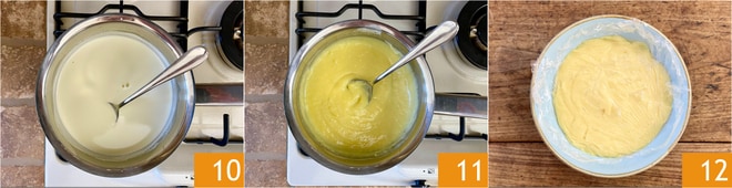 Versez le mélange dans une casserole antiadhésive et mélangez avec une cuillère en cuisant à feu doux 10. Laissez cuire la crème pâtissière, sans jamais cesser de mélanger jusqu'à ce qu'elle épaississe 11. Cela prendra quelques minutes. Transférez la crème dans un bol, couvrez avec du film alimentaire en contact et laissez refroidir 12.