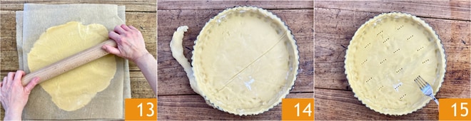 Reprenez la pâte sablée et étalez-la entre deux feuilles de papier cuisson légèrement farinées avec le rouleau à pâtisserie 13. Tapissez le moule à tarte de 24 cm de diamètre, préalablement beurré, avec la pâte. Découpez l'excédent de pâte 14 avec un couteau. Perforez avec les dents d'une fourchette 15.