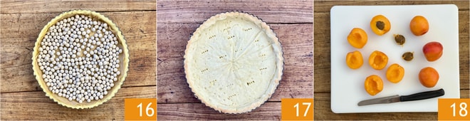 Recouvrez ensuite la pâte sablée avec une feuille de papier de cuisson et versez dessus des haricots secs ou des billes de céramique 16. Cuisez la pâte sablée dans le four préchauffé à 180° en mode statique au milieu du four pendant environ 15 minutes. Sortez du four, retirez le papier cuisson avec les haricots secs 17 et laissez refroidir. Lavez et séchez bien les abricots. Coupez-les en deux et retirez le noyau 18.