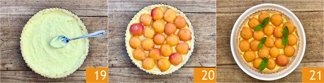 Étalez la crème refroidie au centre de la tarte et égalisez à l’aide du dos d’une cuillère 19. Disposez les moitiés d'abricots avec la peau vers le haut 20. Saupoudrez de sucre de canne. Cuisez dans un four statique préchauffé à 180°C pendant environ 25 minutes, de cette façon les abricots seront plus tendres et légèrement caramélisés. Sortez du four et laissez refroidir complètement. Transférez sur un plat de service et décorez la tarte aux abricots et à la crème avec des feuilles de menthe 21.