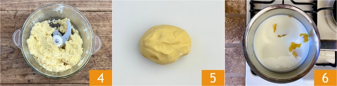 Lorsque le mélange est homogène 4, transférez-le sur le plan de travail. Compressez rapidement avec les mains pour former une boule 5 et enveloppez-la dans du film alimentaire. Laissez reposer au réfrigérateur pendant au moins une demi-heure. Pendant ce temps, préparez la crème pâtissière. Versez le lait entier dans une casserole avec le zeste d'un demi-citron et chauffez à feu doux 6.
