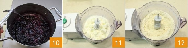 Lorsque la température est atteinte, la compote sera prête, retirez donc la gousse de vanille et mettez-la de côté pour refroidir 10. Pendant ce temps, préparez la pâte sablée. Commencez par le sablage : placez la farine tamisée dans un mixeur 11, une pincée de sel et le beurre juste sorti du réfrigérateur, coupé grossièrement. Mixez le tout jusqu'à obtenir un mélange sableux et farineux 12 ;