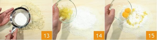 Versez le sablage obtenu sur un plan de travail et ajoutez le sucre glace tamisé 13. Formez une fontaine et au centre, versez le zeste de citron râpé 14 et les jaunes d'œufs 15.
