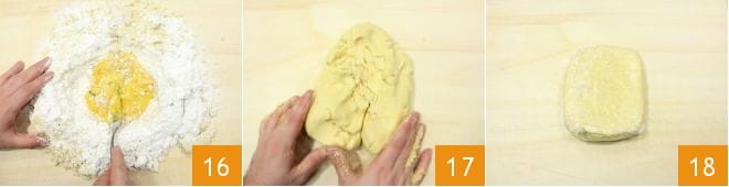 Commencez ensuite à amalgamer le tout d'abord avec une fourchette 16, puis lorsque les œufs ont bien absorbé la farine, vous pouvez continuer à la main 17. Pétrissez brièvement, juste le temps de compacter la pâte, pour éviter que la pâte sablée ne chauffe trop avec la chaleur des mains et reste friable. Formez une boule et aplatissez-la avant de l'envelopper dans du film plastique 18 ;