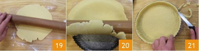 réfrigérez-la pour la raffermir pendant au moins 30 minutes. Après 30 minutes, étalez la pâte sablée avec un rouleau à pâtisserie jusqu'à obtenir une épaisseur d'environ 1 cm 19, puis placez la pâte dans le moule de 24 cm de diamètre 20, retirez les bords qui dépassent du moule 21,
