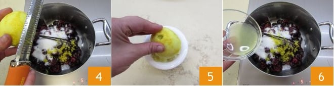 la gousse entière et le zeste râpé d'un citron 4. Pressez ensuite le citron 5, filtrez le jus et versez-le dans la casserole 6.