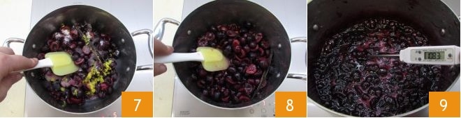 Mélangez le mélange avec une spatule 7 et laissez cuire à feu moyen jusqu'à ce qu'il arrive à ébullition. Ensuite, prenez un peu de liquide des cerises de la casserole, dissolvez-y 5 gr d'agar-agar et ajoutez-le au mélange pour obtenir une consistance plus dense. À ce stade, baissez le feu et laissez cuire pendant au moins 40 minutes 8, en remuant de temps en temps, jusqu'à ce qu'il atteigne une température de 108°, en utilisant un thermomètre de cuisine 9.