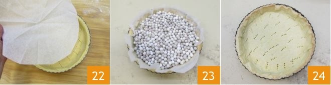 puis piquez la pâte avec une fourchette, recouvrez le moule d'un cercle de papier sulfurisé 22 et versez les billes de céramique, puis continuez avec la cuisson à blanc 23. Enfournez pour 30 minutes à 180° dans un four statique préchauffé (si vous utilisez un four à convection, faites cuire 20 minutes à 160°), puis retirez les billes et faites cuire encore 10 minutes en retirant également le papier sulfurisé pour dorer la base 24.