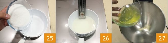 Maintenant, préparez la meringue. Versez l'eau dans une petite casserole, ajoutez le sucre et faites cuire à feu doux 25, en remuant pour le dissoudre. Insérez le thermomètre de cuisine 26 et poursuivez la cuisson jusqu'à atteindre 121°C. Lorsque la température du sirop atteint 114°C, mettez les blancs d'œufs dans un batteur sur socle équipé d'un fouet 27,