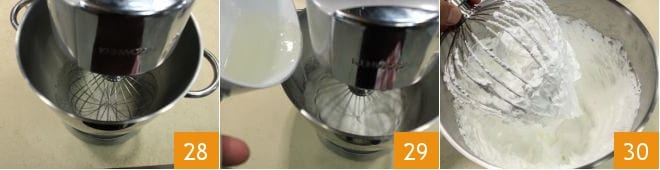 et montez-les en neige à vitesse moyenne 28. Lorsque le sirop atteint 121°, baissez la vitesse du batteur (pour éviter la dispersion du sirop sur les parois du bol), versez la moitié du sirop sur les blancs d'œufs 29 puis augmentez à nouveau la vitesse. Attendez quelques secondes, puis continuez à verser le sirop en filet et à battre jusqu'à complet refroidissement de la meringue. La meringue obtenue doit être très dense, lisse et brillante 30,