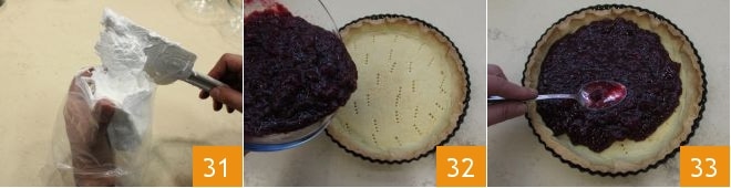 puis une fois prête, transférez-la dans une poche à douille avec une douille étoilée 31. Prenez la pâte sablée cuite, versez dessus la compote de cerises désormais tiède 32 et nivelez-la bien 33.