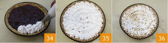 Décorez avec la meringue préparée 34 jusqu'à couvrir toute la surface de la tarte 35 et faites cuire 3-4 min à 240°, juste le temps de dorer la meringue. Votre tarte aux cerises meringuée est prête à être dégustée 36 !