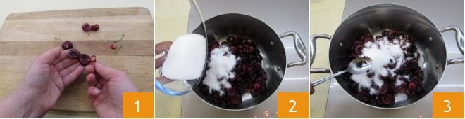 Pour préparer la tarte aux cerises meringuée, commencez par préparer la compote. Lavez et dénoyautez les cerises 1, mettez-les dans une casserole et ajoutez le sucre 2, les graines de la gousse de vanille 3,
