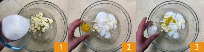 Pour réaliser la tarte aux mûres avec ganache blanche, commence par la pâte sablée : mets dans un bol le beurre, le sucre 1, le zeste de citron râpé 2 et le sel 3, puis travaille avec les mains jusqu'à ce que le sucre soit absorbé.