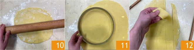 Après le temps de refroidissement, farine légèrement la pâte et étale-la jusqu'à une épaisseur de 3 mm 10. Découpe un disque de 24 cm de diamètre 11 et découpe des bandes de 3 cm de largeur 12.