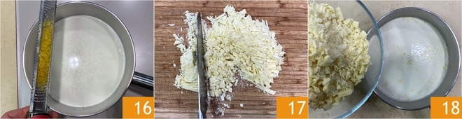 En attendant, prépare la ganache : mets sur le feu une casserole avec la crème et le zeste de citron râpé 16. Entre-temps, hache le chocolat blanc au couteau 17. Lorsque la crème arrive à ébullition, retire la casserole du feu et ajoute le chocolat blanc haché 18.