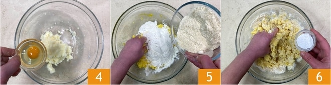 À ce stade, ajoute l'œuf 4 et pétris encore pour l'incorporer. Ajoute la farine 00 et la farine d'amandes 5 et continue à pétrir, puis ajoute également la levure 6.