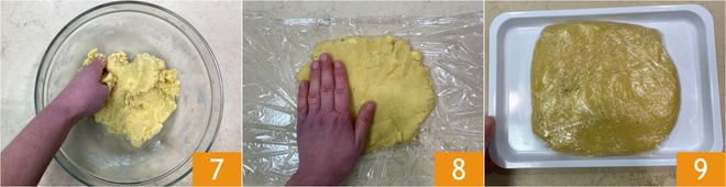 Pétris dans le bol pour incorporer uniformément les poudres 7, puis transfère le mélange sur un film plastique et aplatis-le pour former un pavé 8. Enveloppe la pâte dans le film et laisse reposer au réfrigérateur pendant environ une heure 9.