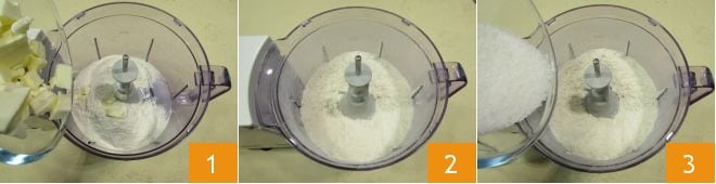 Pour préparer la tarte myrtilles et chocolat, commencez par la pâte sablée. Dans le mixeur, versez la farine avec le beurre et une pincée de sel 1 et mixez jusqu'à obtenir un mélange sableux 2. À ce stade, continuez à travailler le tout dans le robot en ajoutant le sucre 3.