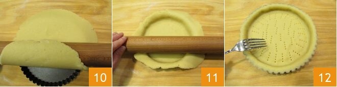 et ensuite la dérouler sur le moule 10. Retirez l'excédent de pâte en passant le rouleau à la surface 11 ou la lame d'un couteau (vous pouvez congeler l'excédent de pâte enveloppé dans un film plastique ou réaliser de délicieux biscuits) puis piquez le fond avec les dents d'une fourchette 12.