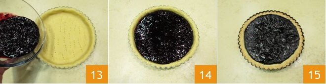 Versez à ce moment la compote de myrtilles 13 et nivelez pour la répartir complètement sur toute la surface 14. Faites cuire la tarte dans un four préchauffé en mode statique à 180° pendant 40 minutes sur la grille la plus basse; une fois prête, sortez-la et laissez-la complètement refroidir 15.