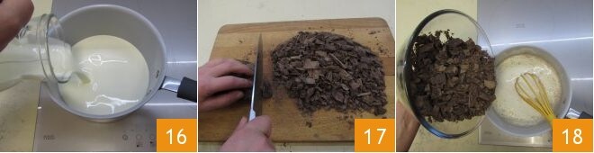 Une fois la base refroidie, préparez la ganache montée. Mettez la crème à chauffer dans une casserole jusqu'à ce qu'elle frôle l'ébullition 16. Pendant ce temps, hachez le chocolat noir 17 et ajoutez-le à la crème suffisamment chaude : mais d'abord, éteignez le feu 18 !