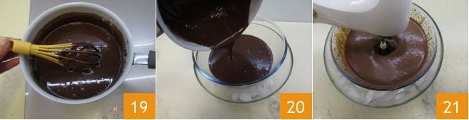 À ce stade, vous devrez mélanger continuellement avec un fouet jusqu'à ce que le chocolat soit complètement fondu 19. Puis transférez dans un bol et placez ce dernier dans un autre récipient où vous aurez versé de l'eau et de la glace 20. Ensuite, actionnez les fouets électriques et montez pendant quelques minutes 21.