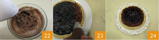 Vous devrez obtenir une crème consistante, cela prendra 3-4 minutes (les temps sont indicatifs car cela dépend beaucoup des températures des bols et de l'environnement) mais faites attention à ne pas la laisser trop longtemps au froid sinon elle deviendra impossible à travailler 22. Transférez-la dans une poche à douille avec une douille étoile et commencez à décorer la tarte myrtilles et chocolat 23. Enfin, décorez avec quelques myrtilles fraîches et dégustez 24 !