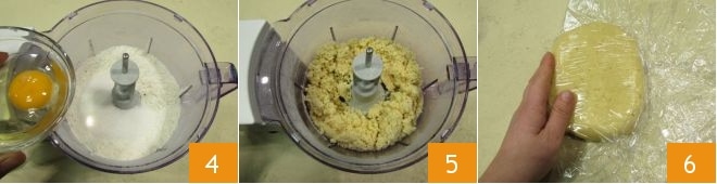l'œuf 4, le zeste de citron et actionnez à nouveau les lames : cette fois-ci, vous devrez seulement mélanger donc réduisez la vitesse pour mélanger. Dès que le mélange est compact 5, transférez-le sur le plan de travail et pétrissez quelques instants pour obtenir une pâte homogène. Enveloppez-la dans un film plastique et laissez reposer au réfrigérateur pendant au moins une heure 6.