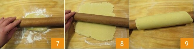 Une fois la pâte refroidie, reprenez-la, placez-la sur un plan de travail avec une pincée de farine et tapez-la vigoureusement pour lui redonner de la plasticité 7, saupoudrez encore d'une pincée de farine et étalez la pâte avec le rouleau 8 pour obtenir un disque d'environ 1 cm d'épaisseur, suffisamment grand pour recouvrir un moule de 20 cm (il n'est pas nécessaire de le beurrer et de le fariner avant, car cette pâte est très beurrée). Pour vous aider à l'étaler, vous pouvez enrouler la pâte sur le rouleau 9.
