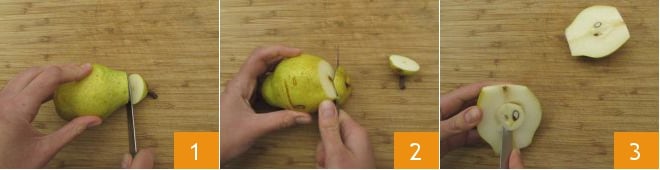 Pour préparer la tarte aux poires, lavez les poires et séchez-les. Ensuite, sans les éplucher, retirez la tige et la base (1-2), divisez-les en deux et enlevez le trognon à l'aide d'un petit couteau 3.