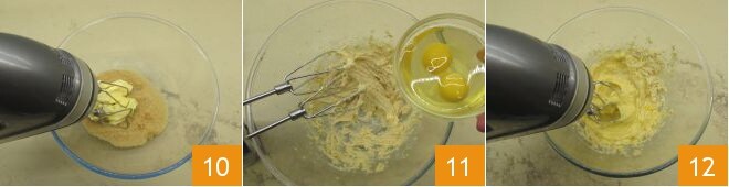 Travaillez avec les fouets 10 pendant quelques minutes, puis ajoutez les œufs un à un (11-12).