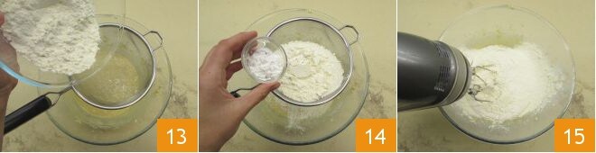 Ajoutez dans le bol la farine et la levure tamisées (13-14), puis continuez à travailler avec les fouets 15