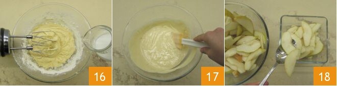 et lorsque la farine et la levure seront presque entièrement absorbées, versez également le lait 16. Travaillez encore avec les fouets pour obtenir une pâte homogène et sans grumeaux 17. Prélevez 1/3 des poires et mettez-le de côté 18;