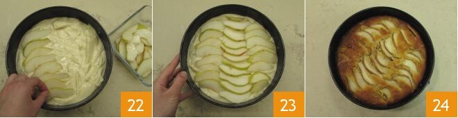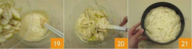 versez les 2/3 restants de poires dans la pâte et mélangez (19-20). Beurrez un moule à charnière de 22 cm de diamètre et 6,5 cm de hauteur et versez-y la pâte 21.