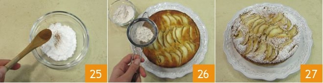 Mélangez le sucre glace avec ½ cuillère à café de cannelle 25 et saupoudrez la tarte aux poires avant de la servir (26-27).