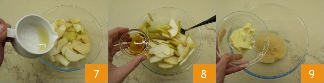 et arrosez les tranches de poire 7. Mélangez et ajoutez également le rhum 8, puis mettez de côté. Passez à la pâte : versez dans un bol 100 g de sucre de canne, ajoutez le beurre très mou 9.