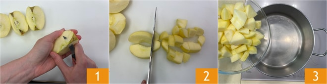 Pour préparer la tarte aux pommes avec crumble, commencez par la compote de pommes : pelez les pommes, coupez-les en quartiers et retirez le trognon 1, vous en obtiendrez environ 220 g. Coupez-les en morceaux 2 et mettez-les dans une casserole 3.