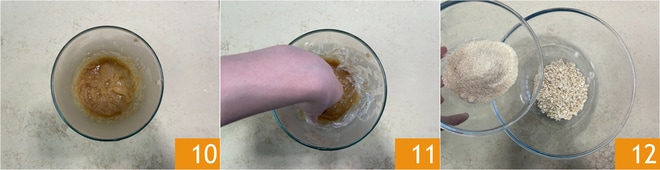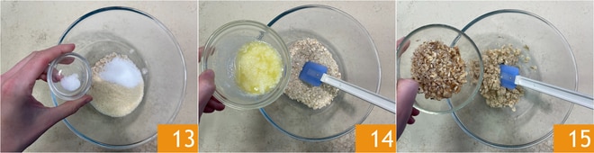 Vous devez obtenir une purée lisse et homogène 10. Couvrez-la de film plastique au contact 11, laissez refroidir puis transférez-la au réfrigérateur jusqu'à utilisation. Maintenant, occupez-vous du crumble : dans un bol, mettez les flocons d'avoine et la farine d'amande 12.
